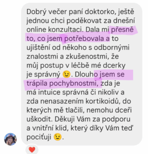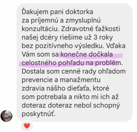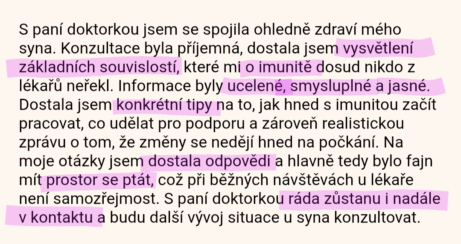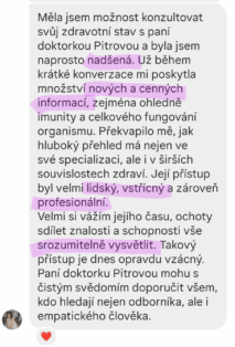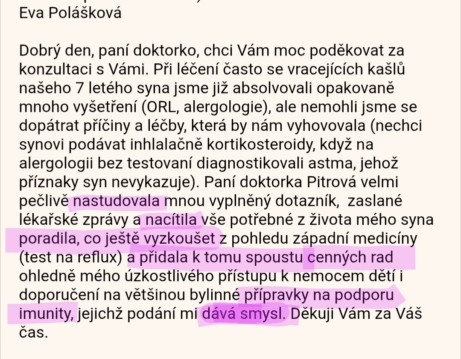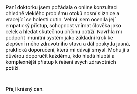 Konzultace s paní doktorkou bylo to nejlepší, co jsem mohla kdy udělat. Moje dcera 5,5 roku měla vleklé zdravotní potíže a já s tím spojených spoustu otázek, které jsem potřebovala zodpovědět a proto jsem potřebovala konzultaci ORL doktora, který by mi věnoval více JAK 10 MINUT SVÉHO ČASU, které má bohužel skoro každý doktor (protože jich je málo) k dispozici, než se musí věnovat dalšímu pacientovi a modlila se za to,abych narazila na někoho takového. Moje modlitby byly vyslyšeny ve chvíli, kdy jsem na Facebooku uviděla profil paní doktorky Pitrové. Paní doktorku jsem ihned kontaktovala, domluvily jsme si termín a následně se mi paní doktorka celé třičtvrtě hodiny věnovala a zodpověděla mi vše, co jsem potřebovala vědět ohledně zdravotního stavu dcery + ještě dala doporučení co udělat,aby se její stav zlepšil. S konzultací jsem byla maximálně spokojená a doporučuji paní doktorku opravdu všem, kteří vnímají zdraví svých dětí jako svoji zodpovědnost a jsou si vědomi toho, že v dnešní době jde pro zdraví dětí udělat neskutečná spousta věcí. Paní doktorce přeji více takto zvídavých a vědomých rodičů.