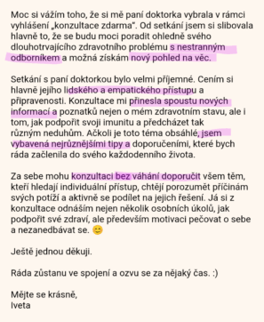 Vidím, že informace potřebujete a hledáte. V klasické ordinaci však při běžném provozu na podrobné vysvětlení není čas. Proto jsem se rozhodla, že chci svoje zkušenosti a znalosti poskytnout i touto formou. Pomoci tak více lidem a dopřát vám potřebný čas na vysvětlení.