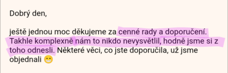 - 4Emailem vám následně přijdou důležité informace. Odkaz na meet, kde se sejdeme a anamnestický dotazník. Ten mi prosím vplňte a odešlete včas, abych si vše stihla připravit. Ušetříme tak čas konzultace a budeme moci jít přímo k věci.