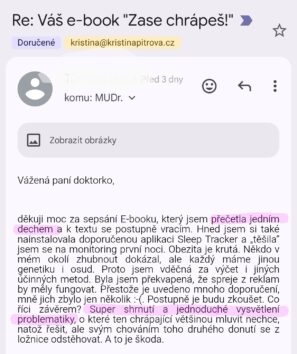 E-book Zase chrápeš je perfektní průvodce všem, pro které je toto téma aktuální. Na jednom místě naleznete ucelené informace, od toho jak chrápání vzniká, přes vysvětlení jak nás může ohrožovat, až po konkrétní možnosti řešení. Poradí co můžete udělat sami, i jaké jsou možnosti léčby a operací u závažnějších stavů. Knihu bych doporučila všem, které toto téma trápí. Krásně nás nakopla k tomu, problém opravdu řešit. Děkujeme.